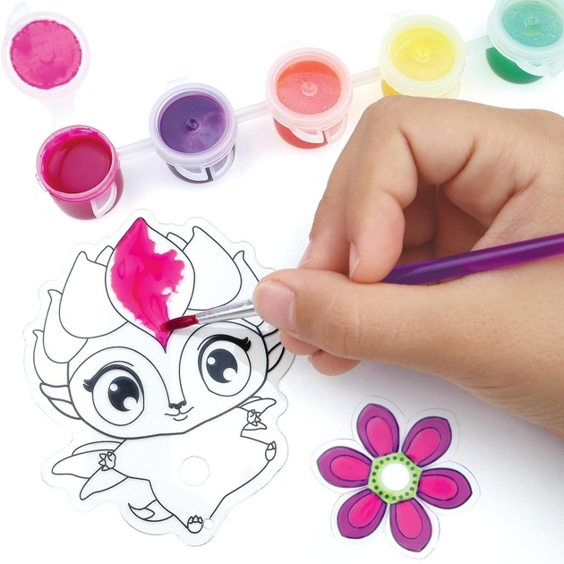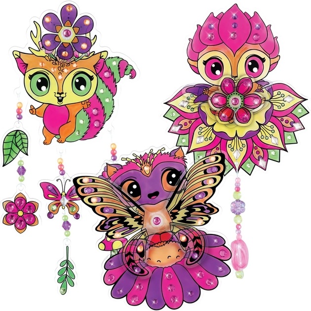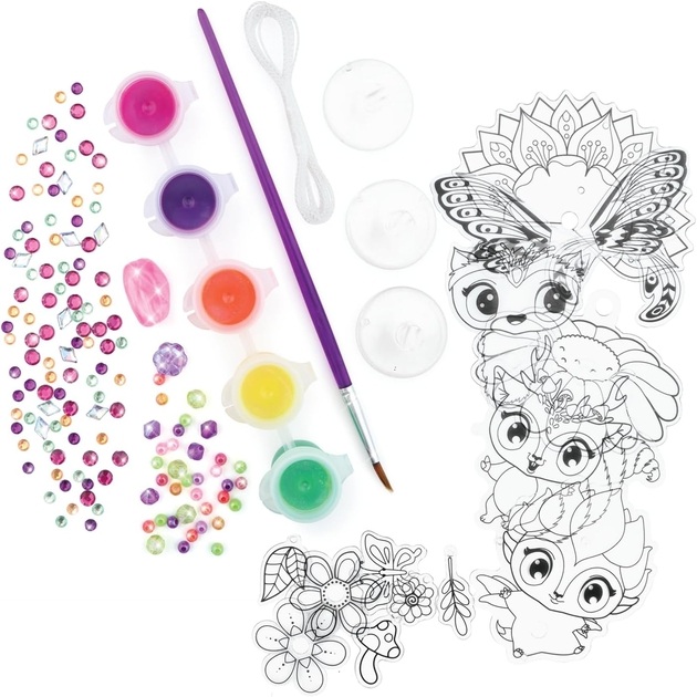 Créez 3 charmantes breloques pour fenêtre. Le coffret comprend 13 pièces prêtes à peindre, 5 peintures pour verre, un pinceau, des perles assorties, une ficelle, une variété de strass et 3 ventouses.