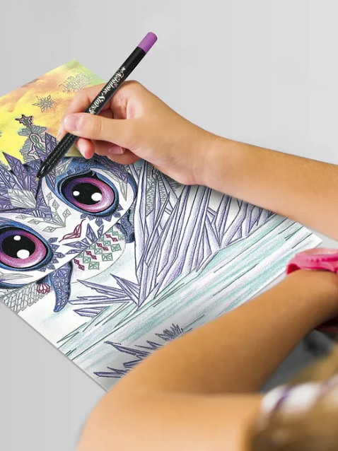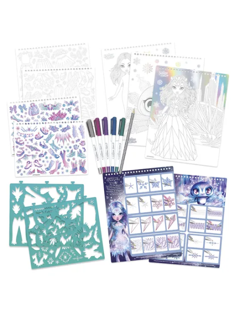 Contenu : 30 pages de croquis, 80 pochoirs, plus de 110 autocollants originaux, un crayon (gris), 5 feutres, 8 techniques de dessin, l’histoire complète de l’étoile Iceana, instructions.