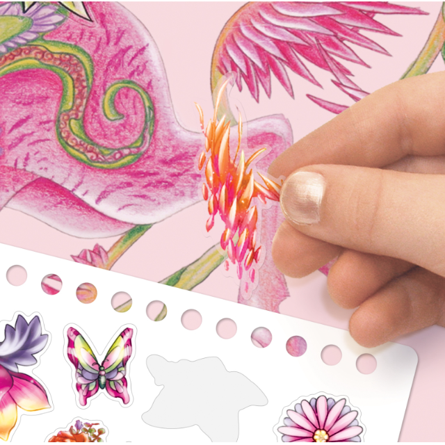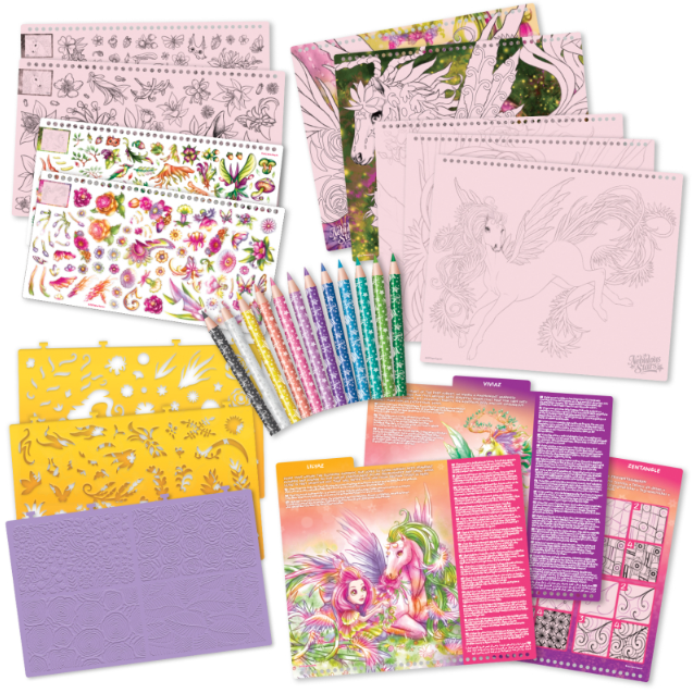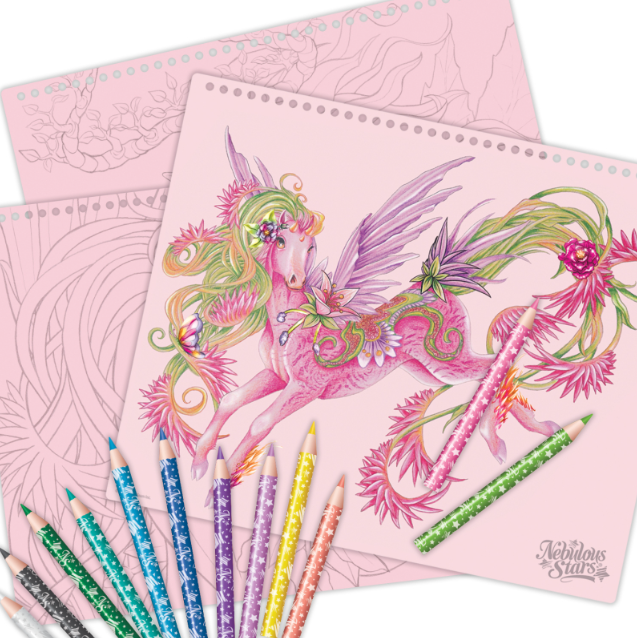 Créez de mystérieux et magnifiques chevaux fantastiques, prêts à galoper parmi les étoiles. Utilisez une variété d’autocollants, de pochoirs et différentes techniques pour concevoir les chevaux de vos rêves. Dessinez des chevaux fantastiques magiques et extraordinaires sur des pages à colorier.