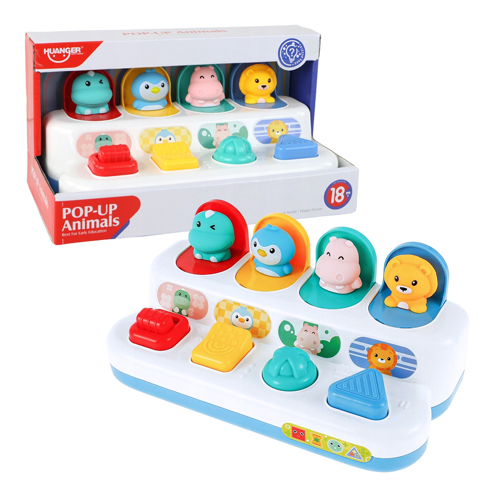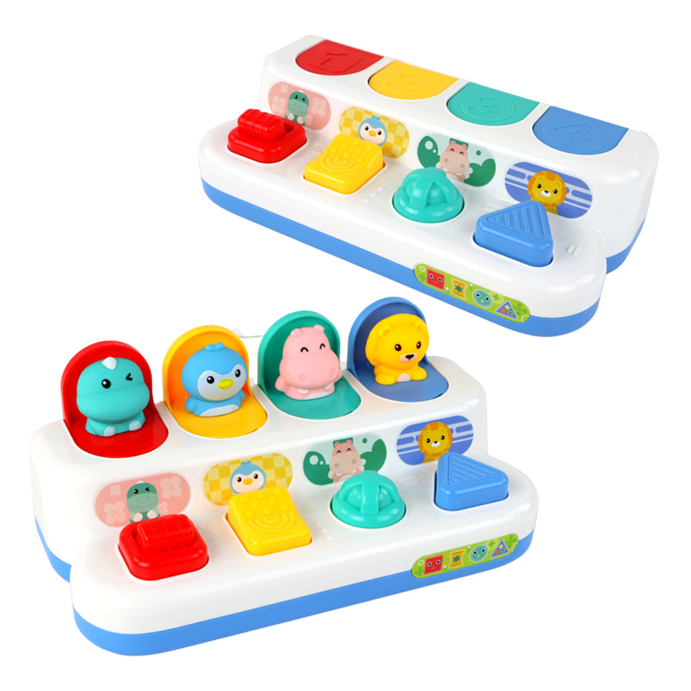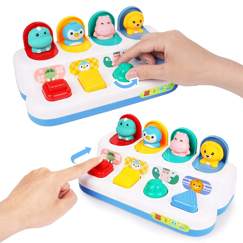 Ce jouet interactif et amusant encouragera les tout-petits à explorer ! Des boutons colorés de formes et de couleurs variées révéleront un hippopotame, un pingouin, un lion et un dinosaure qui surgissent de sous leurs couvercles en appuyant, en tournant ou en tirant, ce qui aidera les tout-petits à développer leurs capacités motrices et cognitives. Après le jeu, les enfants pourront baisser le couvercle pour endormir les animaux jusqu’au prochain jeu !