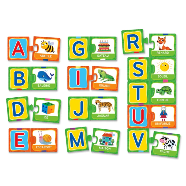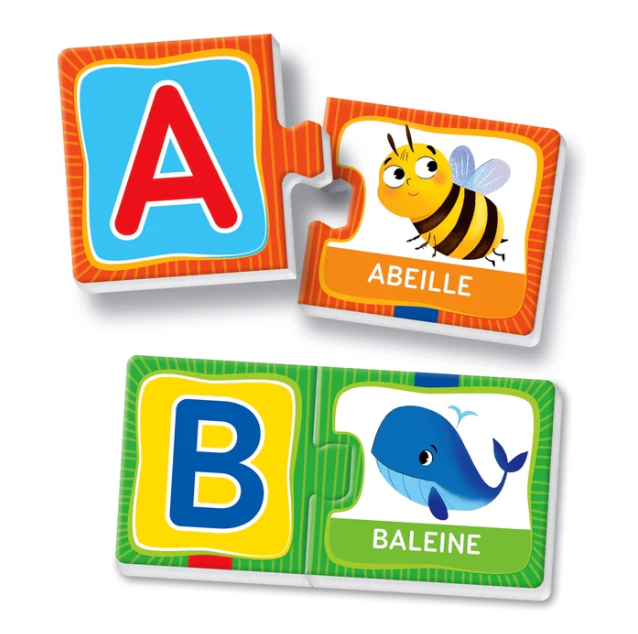 26 mini-puzzles illustrés à assembler pour apprendre les lettres de l’alphabet et les premiers mots.