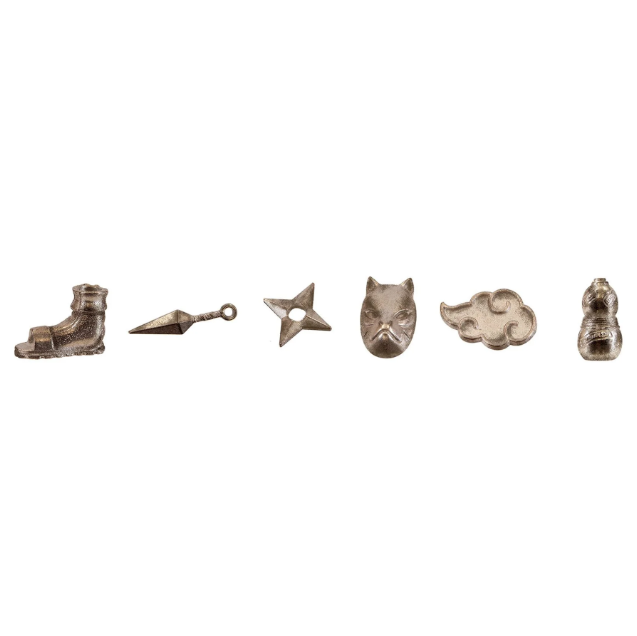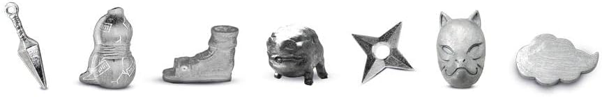 - Contient 6 jetons sculptés sur mesure : la gourde de sable de Gaara, le nuage d’Akasuki, le masque Anubu de Kakashi, la sandale de shinobi, le kunai et le shuriken.