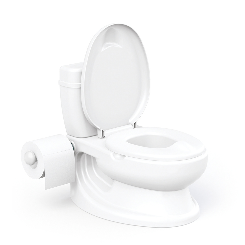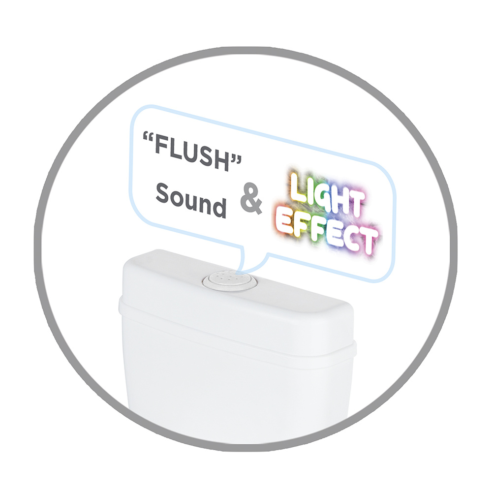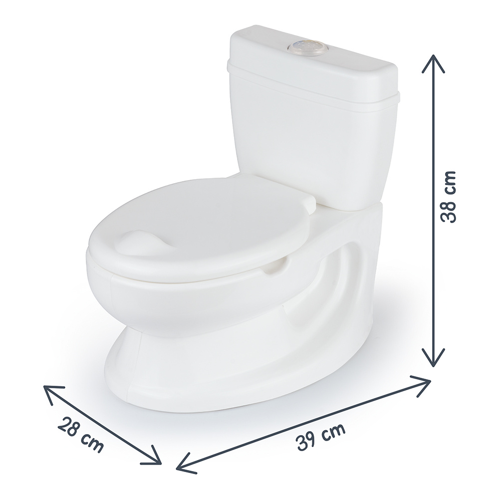 Caractéristiques : soulevez le couvercle et le siège des toilettes, pot amovible pour faciliter l’élimination et le nettoyage, porte-rouleau rétractable sur le côté, rangement pour les lingettes ou les jouets à l’arrière de l’appareil, et un bouton poussoir sonore réaliste.